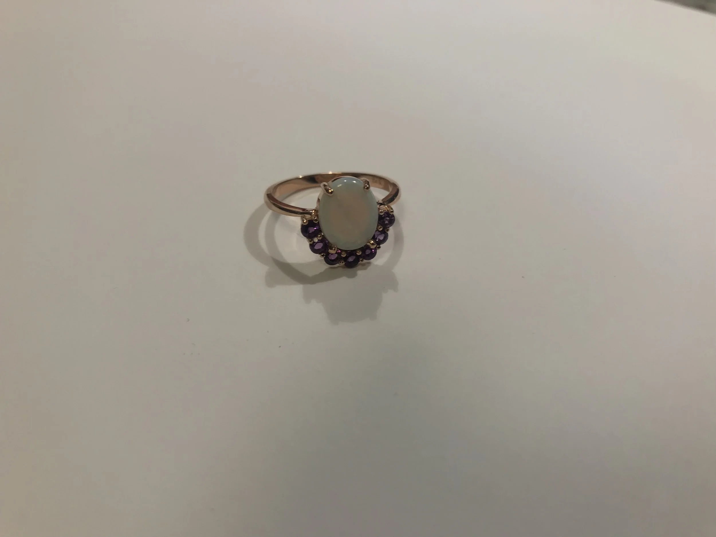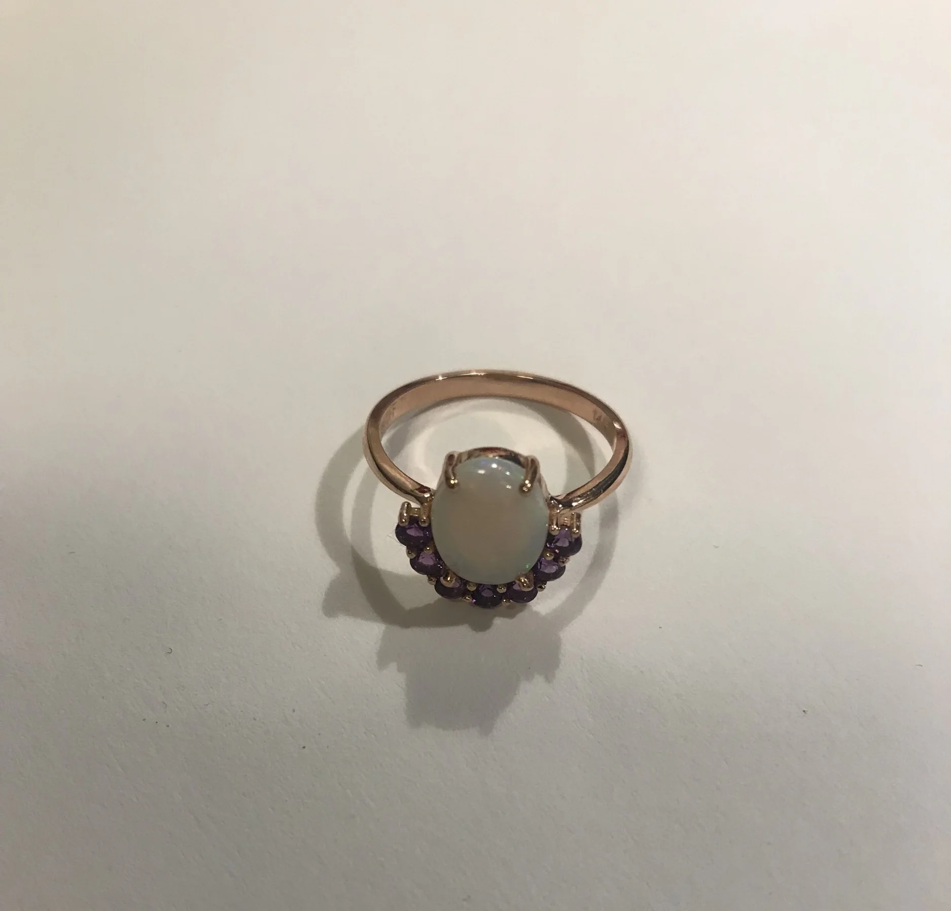 14k Rose gold with prong-set opal center stone and amethyst accent stones.